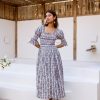 Crafted from breathable cotton and hand block-printed in vibrant, feel-good colors, this one’s made to brighten your day. The body features colorful smocking that hugs just right, while puff sleeves with matching smocked details add a fun, flirty touch. A square neckline keeps it sweet and structured, and yes—it has pockets.