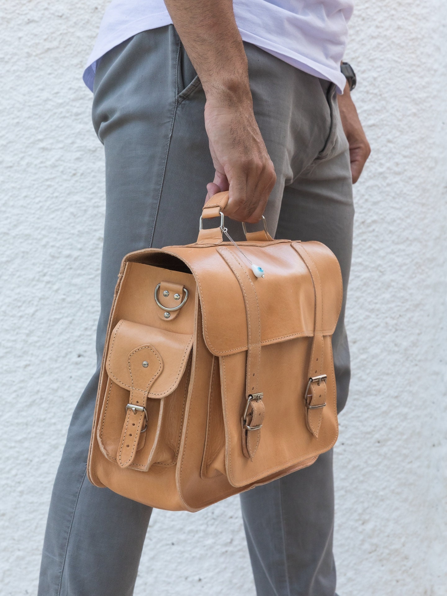 Introducing our handcrafted leather messenger bag, meticulously made from 100% full grain leather in a stunning natural color. This sophisticated briefcase features a removable key ring, adding an element of uniqueness to its design. With ample space, it effortlessly accommodates all your office essentials in style. Perfectly sized to fit a 15″ laptop, this bag exudes both elegance and functionality. Discover this exclusive item only at our Store. Elevate your professional image today.